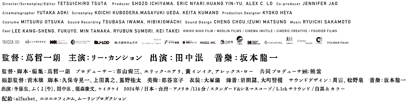 ツァイ・ミンリャン作品のアイコンであり、自身も映画を監督している台湾の名優リー・カンションが、この世ならざるものの気配をまとい「⽜と出会う者」を演じ、映画『国宝』で歌舞伎役者・⼩野川万菊役で強烈な印象を残し、先ごろ文化功労者にも選ばれたダンサーの⽥中泯が禅僧として出演。音楽には、⽣前本作の企画に賛同し参加を表明していた坂本⿓⼀の楽曲を使⽤し、場所や時代を超越した世界観をさらに深く印象づけている。